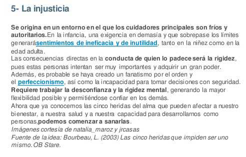 Las frases introductorias son deducciones mías, pero la autora y quien dio nombre a estas cinco heridas emocionales es Lise Bourbeau.